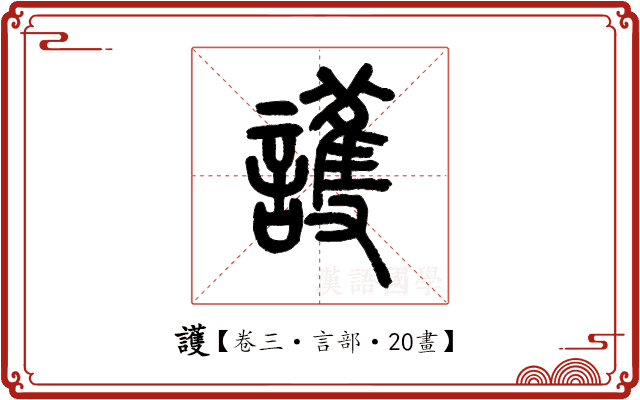 护,救治并看顾。字形采用“言”作边旁,采用“蒦”作声旁。